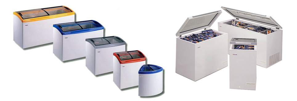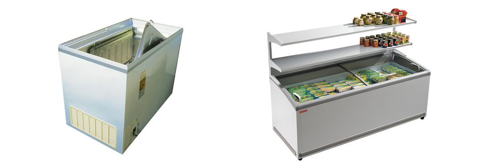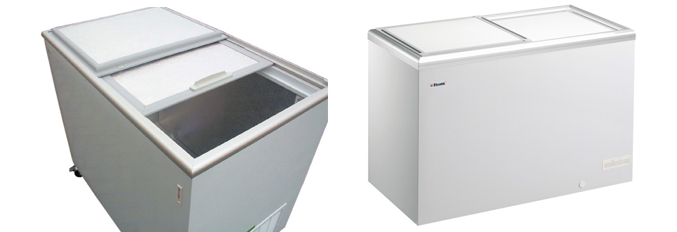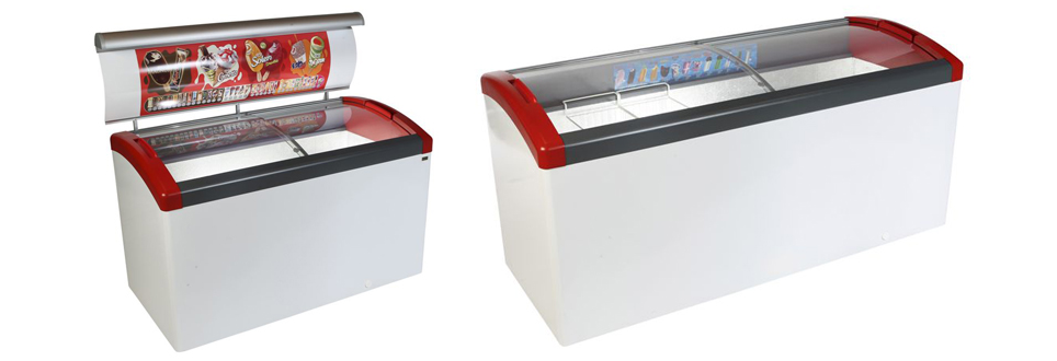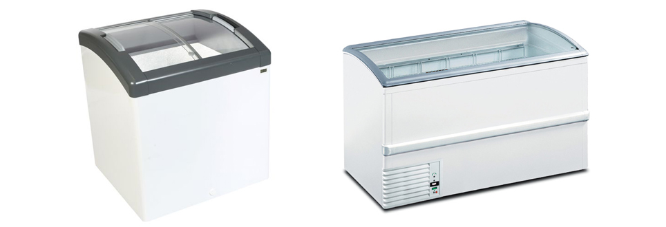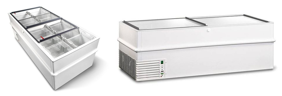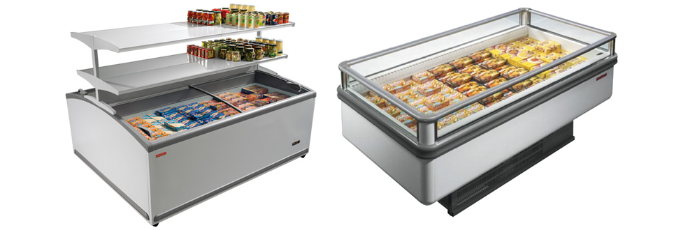 Diepvrieskisten met vlakke of gebogen glazen schuifdeksels. Diepvries- en koeleilanden met efficiënte afdekkingen, voor winkels en supermarkten.